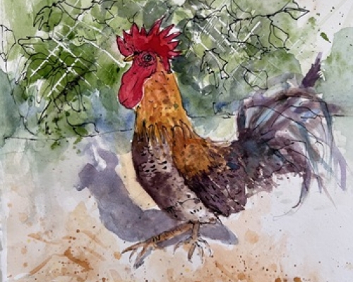 Proud Cockerel £175.00 Latest: yes Portfolio: yes £175.00An original ink/watercolour in a white mount and a white frrame Approx size 42 cm w x 51 cm h