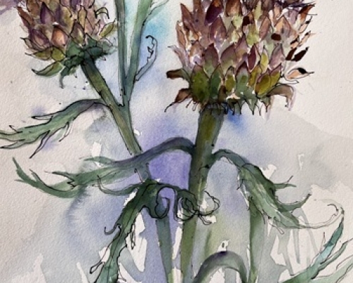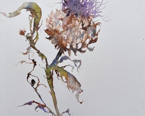 Thistle £250.00 Archive: yes Sold: SOLD £250.00An original ink and watercolour painting in a white mount and white frame. Approx size. 48 cm h x 47 cm w Packing and postage at cost.