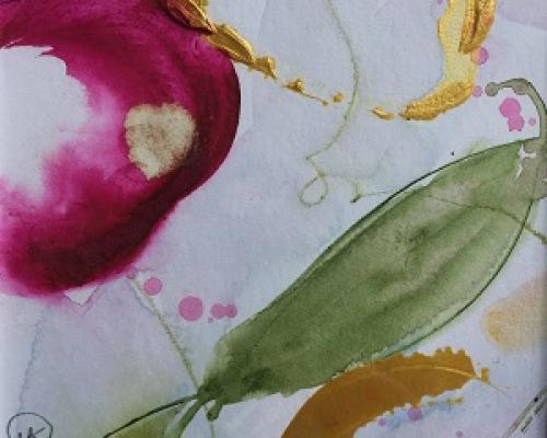 Sweetpea III £70.00 Latest: yes Portfolio: yes £70.00An original watercolour with gold acrylic paint in a white mount. 23x23 cm