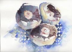 Mushrooms on Gingham II £145.00 Latest: yes Portfolio: yes £145.00Original watercolour painting in a white mount. 38x38cm