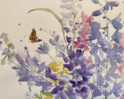 Wing Tips and Petals £265.00 Archive: yes Portfolio: yes Sold: SOLD £265.00An original watercolour in a white mount and a white frame Approx size 53 cm w x 48 cm h Postage and packing at cost.