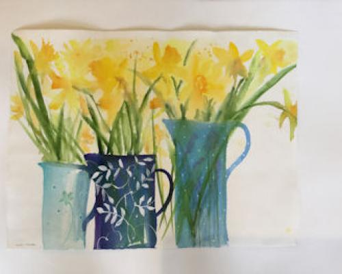 Daffodils in Blue Jugs £265.00 Archive: yes Sold: SOLD £265.00Original watercolour in double white mount. Price includes ostage and packing Approx. size 64 cm w x 44 cm l