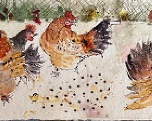Happy Hens £150.00 Archive: yes Sold: SOLD £150.00An original mixed media painting in a white mount and white frame. Approx. size 46.5 cm w x 28 cm h Postage and packing at cost.