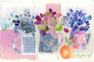 Hydrangea Pots Collage £145.00 Archive: yes Sold: SOLD £145.00Size: 29 cm h x 38 cm w Original mounted watercolour painting in white mount.