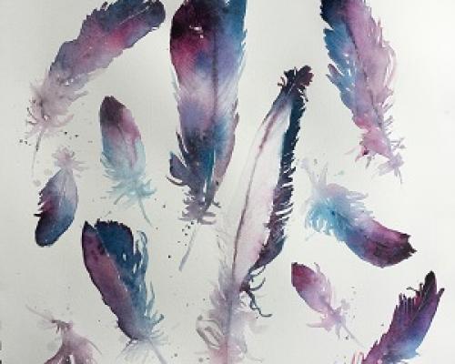 Drifting Feathers £265.00 Archive: yes Sold: SOLD £265.00An original watercolour in a white mount and a white frame. Approx size 49 cm x 49 cm Postage and packing at cost.