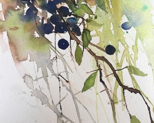 Sloes in the Hegerow £155.00 Latest: yes Portfolio: yes £155.00An original watercolour painting in a white frame with a double mount 30.5x38.5 cm