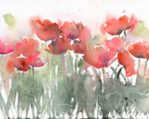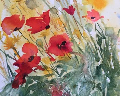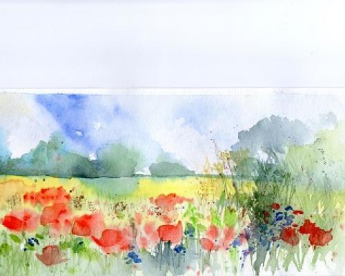 Poppy meadow £125.00 Archive: yes Sold: SOLD £125.00An original watercolour in white double mount. Approx size 38cm w x 24 cm h Price includes postage and packing
