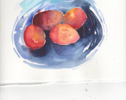 Plums in a blue dish £125.00 Archive: yes Sold: SOLD £125.00An original watercolour in a white mount. Approx. size 28cm w x 25cm h Price includes postage and packing
