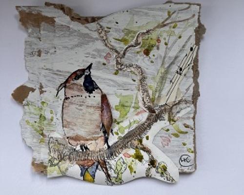 An original mixed media painting float mounted on a white mount in a white frame.