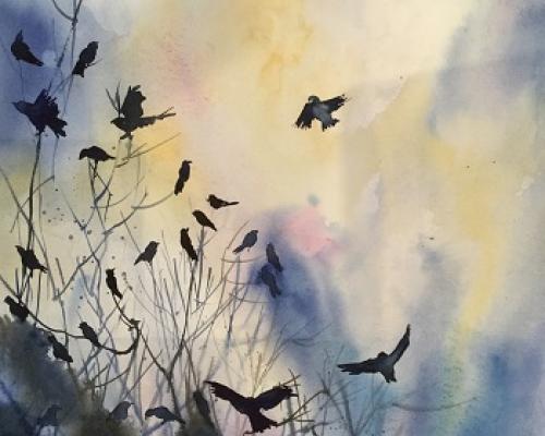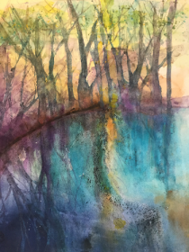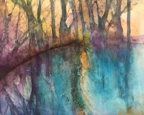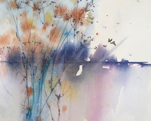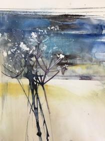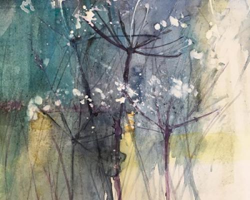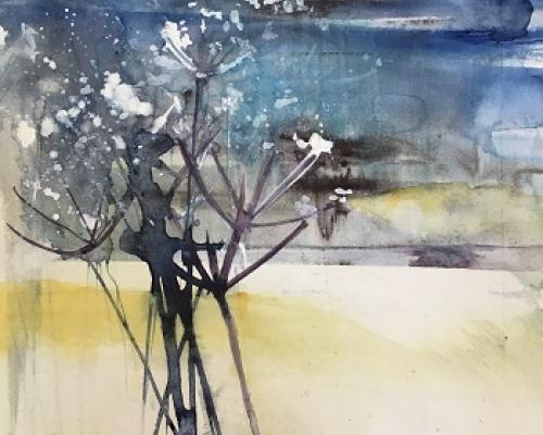 Blue Green fen with hogweed in the foreground. Atmospheric mood