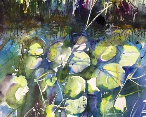 Waterlilies at Wicken Fen £250.00 Archive: yes Sold: SOLD £250.00An original watercolour/acrylic ink painting in white double mount. Approximate size: 48 cm w x 55 cm h. Price includes postage and packing.